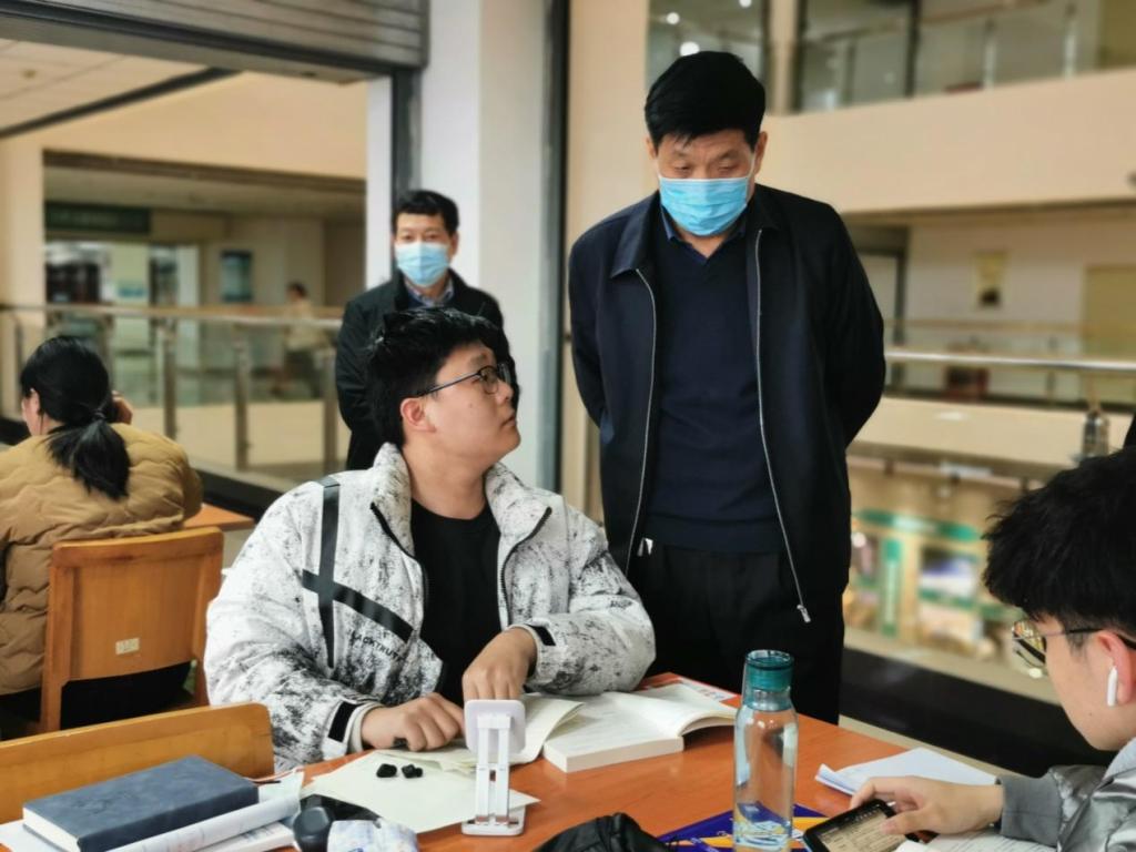 陈丙义从一楼步行至七楼逐层进行了实地考察,并与学生进行了亲切交谈,鼓励他们努力学习、积极备战考研,争取考出好成绩。图书馆馆长详细介绍了图书馆的布局结构、馆藏文献资源、智慧图书馆建设、学生阅览情况、图书借阅量、电子文献、服务优化等情况。陈丙义对图书馆在资源建设、学生服务等方面的工作给予了充分肯定,对不足之处给予了现场指导。