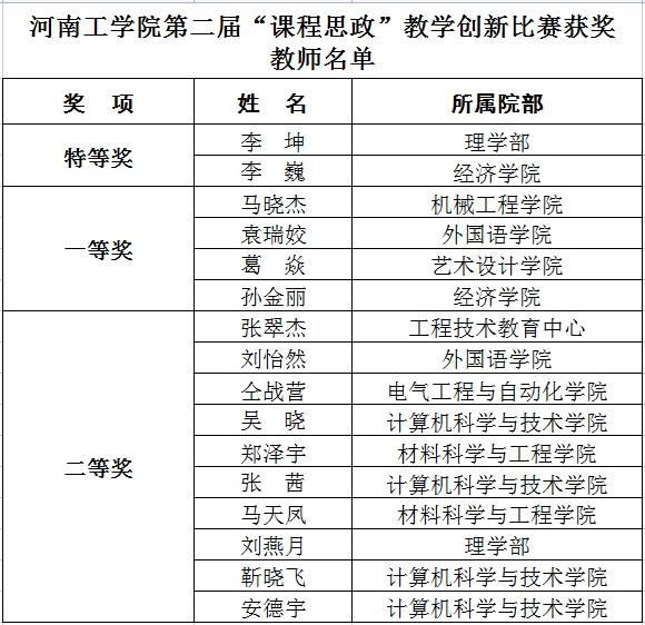 11月11日,河南工学院第二届“课程思政”教学创新比赛在创新楼9楼智慧教学中心圆满落幕。经过激烈角逐,理学部李坤、经济学院李巍2名教师获特等奖,机械工程学院马晓杰、外国语学院袁瑞姣、艺术设计学院葛焱、经济学院孙金丽4名教师获一等奖,工程技术教育中心张翠杰等10名教师获二等奖。