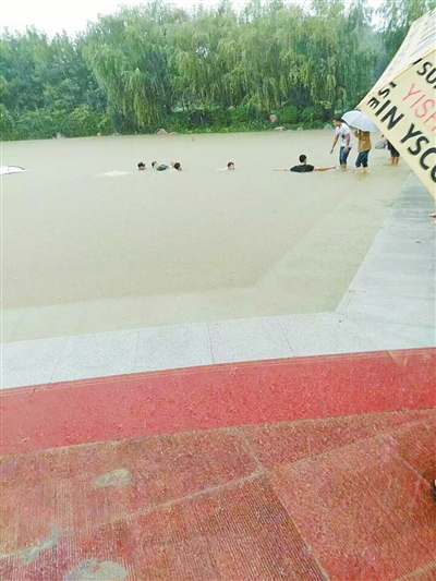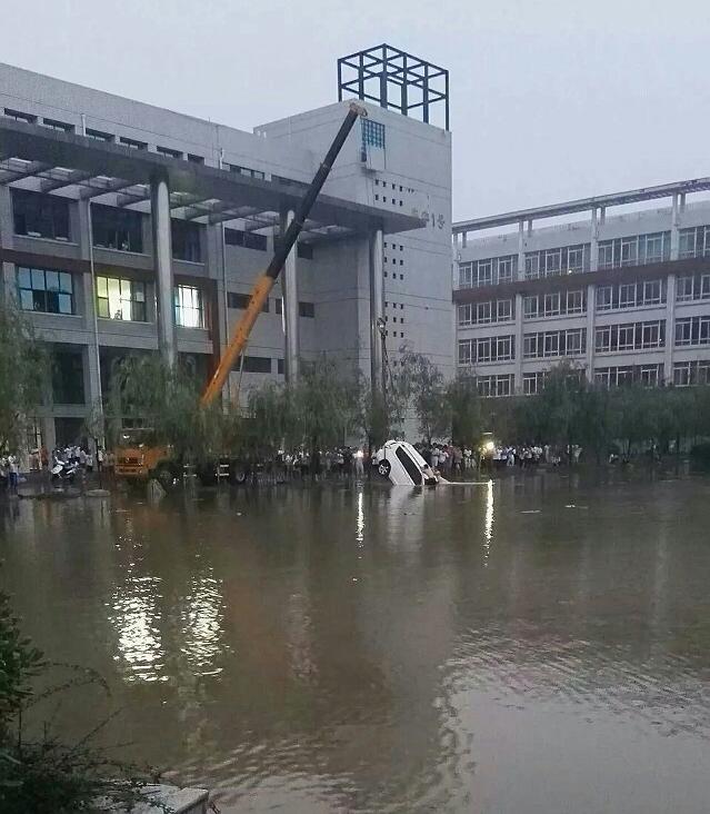 7月9日大雨袭击新乡整座城市,新乡工学院道路也有积水,早上8点多钟,机电工程系学生齐高飞等在去北区办公楼值班的路上,一辆RAV4越野车,由于雨太大,车主不熟悉路况,来不及刹车,车子直接冲进学子湖。