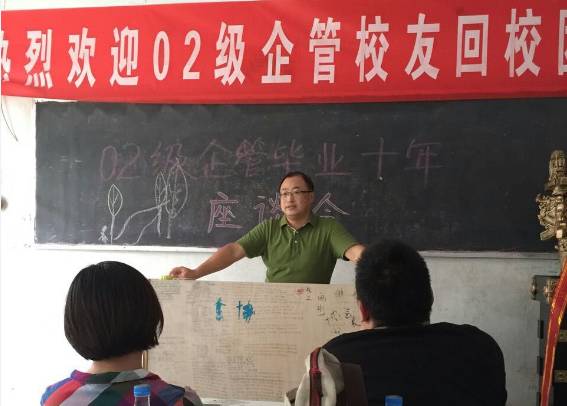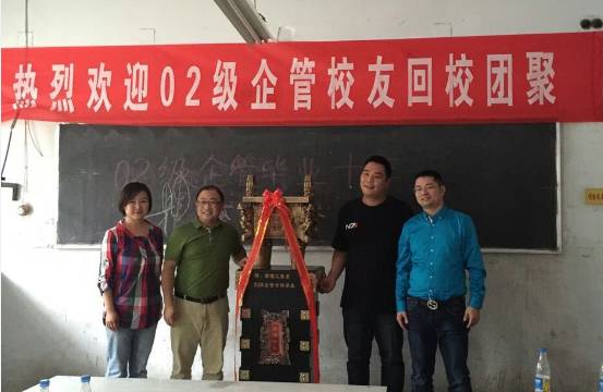 饭后,全体校友又来到老校区,在2号教学楼106室召开了毕业十周年座谈会。座谈会由昔日企管班长胡耀东主持,管理系副主任尚林鹏老师致欢迎辞并介绍了我校和我系十年来的变化和成绩,希望大家关心支持母校的发展;参会同学分别简要介绍了自己十年来的发展和感悟,对母校专业建设以及人才培养提出了宝贵的意见;随后,昔日班主任陈姗姗老师表达了对校友的期望和祝福;最后校友代表发言并向我系赠送了金鼎以表达对母校的感恩和祝福。座谈会温馨和谐,洋溢着浓浓的师生情和同学情。会后,校友在老校区故地重游并留影,并到新校区参观,感受我校这些年的巨大变化。
