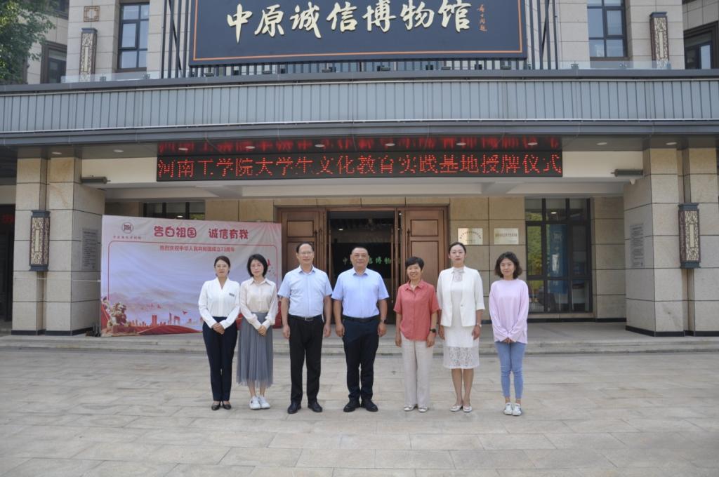 9月29日,我校“大学生文化教育实践基地”授牌仪式在中原诚信博物馆成功举行。该实践基地的建立,为我校大学生搭建了深入理解诚信、践行诚信,发扬光大诚信文化的实践平台。河南工学院原马克思主义学院院长王玉萍、校团委书记郭宇及诚城社区党委副书记、中原诚信博物馆执行馆长孔庆国,诚城集团党委副书记张永利等参加了授牌仪式。