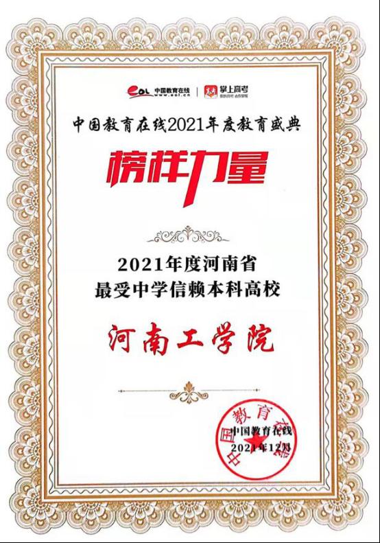 近日,在中国教育在线举办的“2021年度教育盛典榜样力量”评选活动中,我校获评“2021年河南省最受中学信赖本科高校”。