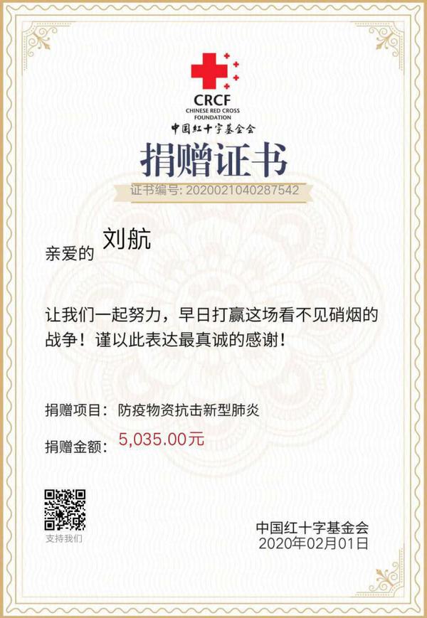 刘航,学校机械工程学院一名大三学生,妈妈是教师,同时也是共产党员,爸爸、爷爷、奶奶都是地地道道的农民。面对疫情,全家一致决定贡献一份力量。本想买点物资捐献给家乡的相关单位,因为村庄封路,最终没有买到。于是刘航拿出了过年的压岁钱、节前打工挣的辛苦钱、平时攒的零花钱,足足拼凑了5035元,直接通过线上捐献给了中国红十字基金会的抗击新型冠状病毒专项资金项目。