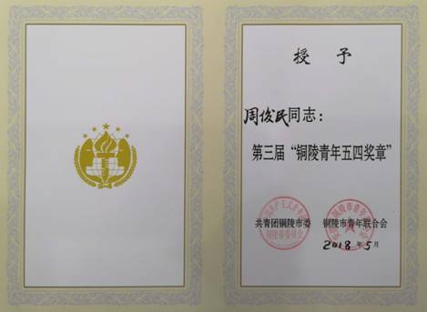 2018年5月2日,共青团铜陵市委员会联合铜陵市青年联合会为表彰周俊民的成绩,授予周俊民“铜陵青年五四奖章”。