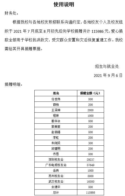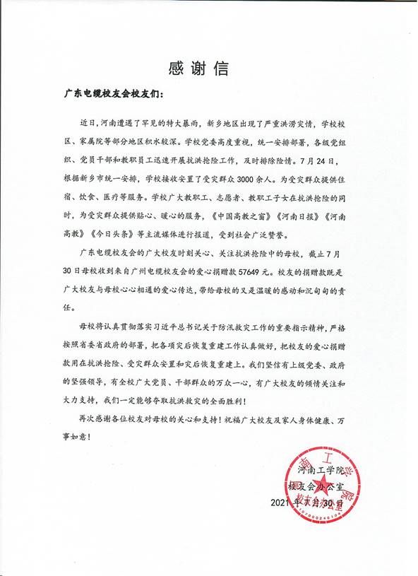 7月中旬,受强降雨影响,河南省多地出现洪涝灾害,暴雨引发的灾情牵动着河南工学院广大校友的爱心。收到母校洪涝灾情后,河南工学院各地各专业校友纷纷向母校伸出援助之手,捐物捐钱,展现了河工人的担当与爱心。截至9月初,收到校友捐赠人民币累计115986元。洪灾面前,河南工学院校友们显担当,伸出援手暖人心,展示了优秀的河工风采与河工精神!