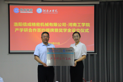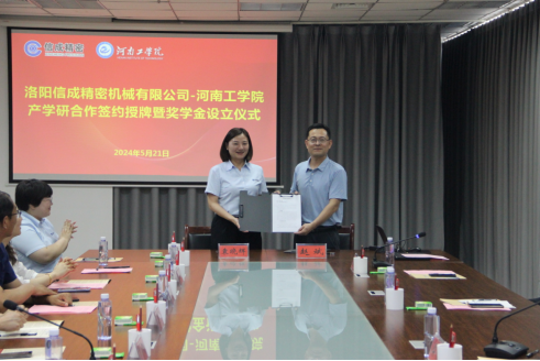 5月21日,我校与洛阳信成精密机械有限公司产学研合作签约授牌暨奖学金设立仪式在图书馆第四会议室举行。校党委副书记、副校长梁静,洛阳信成精密机械有限公司董事长丁向阳,河南科技大学商学院对外交流与合作中心主任高延军,洛阳普天电话装备制造有限责任公司副总、财务总监王辉及我校科研处、电气工程与自动化学院负责人等参加了本次签约仪式。